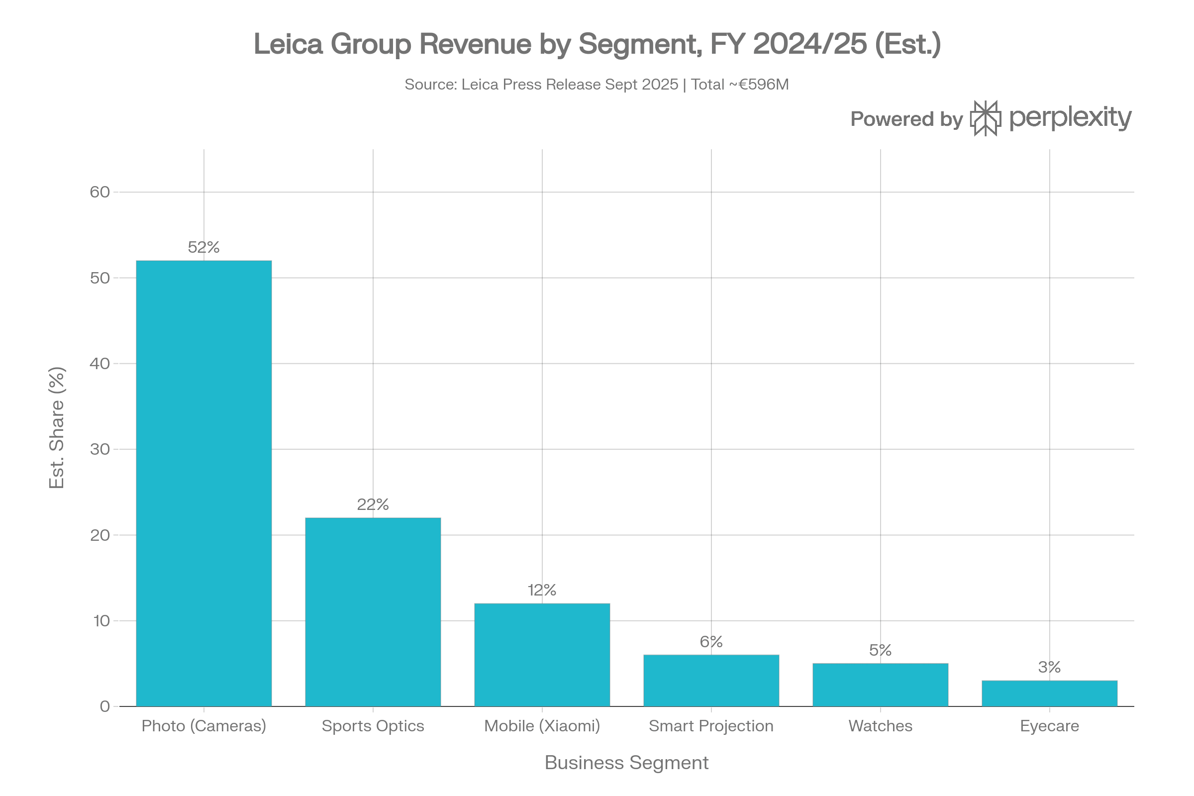 Leica was born in Wetzlar, Germany. They built the first 35mm camera. Revenue in 24/25 sits at 596 million Euros, driven primarily by the photo and mobile segments. Six product lines: cameras, sports optics, lifestyle products, watches, projectors, and eyewear.
